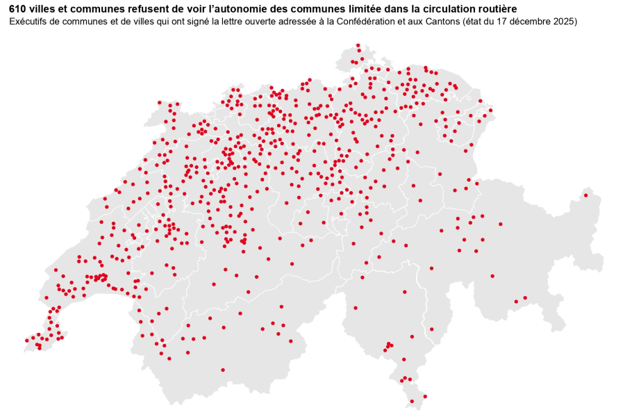 Plusieurs centaines de villes et de communes demandent expressément à la Confédération et aux cantons de respecter le partage des tâches entre les échelons de l’État et de ne pas restreindre davantage la marge d’appréciation et de manœuvre des communes en matière de mesures de circulation. Environ 600 exécutifs de communes et de villes de la Suisse entière et de toute appartenance politique ont signé une lettre ouverte sur ce sujet. Ils se réfèrent à la proposition de mise en œuvre du Conseil fédéral sur la motion 21.4516 «Consolider la hiérarchie du réseau routier à l’intérieur comme à l’extérieur des localités». La motion vise à rendre plus difficile la mise en œuvre de limitations de vitesse à 30 km/h sur ce que l’on appelle les routes «affectées à la circulation générale». Des initiatives similaires ont été déposées dans plusieurs cantons.